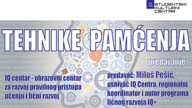 U četvrtak 24.01.2019. sa početkom u 18:00h, predavač Miloš Pešić održaće besplatno predavanje „Tehnike pamćenja“ u maloj sali SKC-a. Predavač Miloš Pešić je osnivač IQ Centra, regionalni koordinator i autor programa ličnog razvoja IQ+.