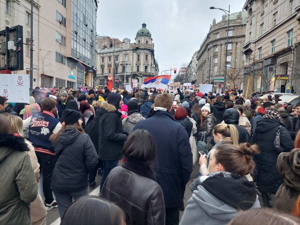 U Beogradu se protest studenata održava ispred zgrade Ustavnog suda kako bi ukazali na kršenje Ustava i podsetili građane na prava koja su im zagarantovana. Kako javlja reporter N1, gužva se proteže od Crkve Svetog Marka do Skupštine Srbije, sve do Ambasade Republike Turske u Takovskoj ulici. Studenti su prikazivali poslednje slučajeve kršenja Ustava i izveli performans sa belim povezima preko očiju.