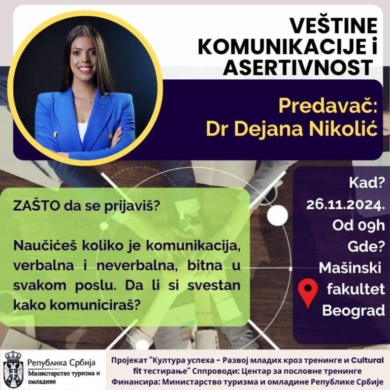 Radionica: Veštine komunikacije i asertivnost (jednodnevna) Predavač: Dr Dejana Nikolić Datum: 26. novembar 2024. godine Vreme: Od 09h Lokacija: Mašinski fakultet, Kraljice Marije 16