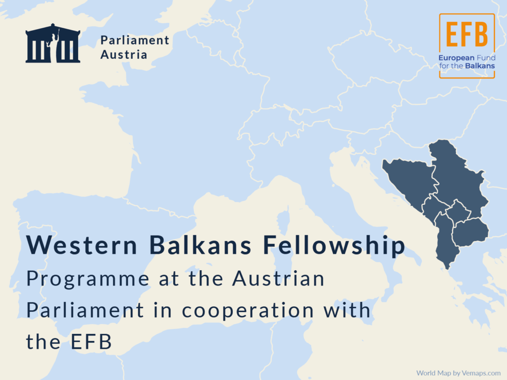 Poziv za prijavu kandidata Evropski fond za Balkan (EFB), kao partner organizacija Austrijskog parlamenta, objavio je poziv za prijavu kandidata za peto izdanje programa stipendiranja državnih službenika iz parlamenata zemalja Zapadnog Balkana i studijsku razmenu i rad u Austrijskom parlamentu.